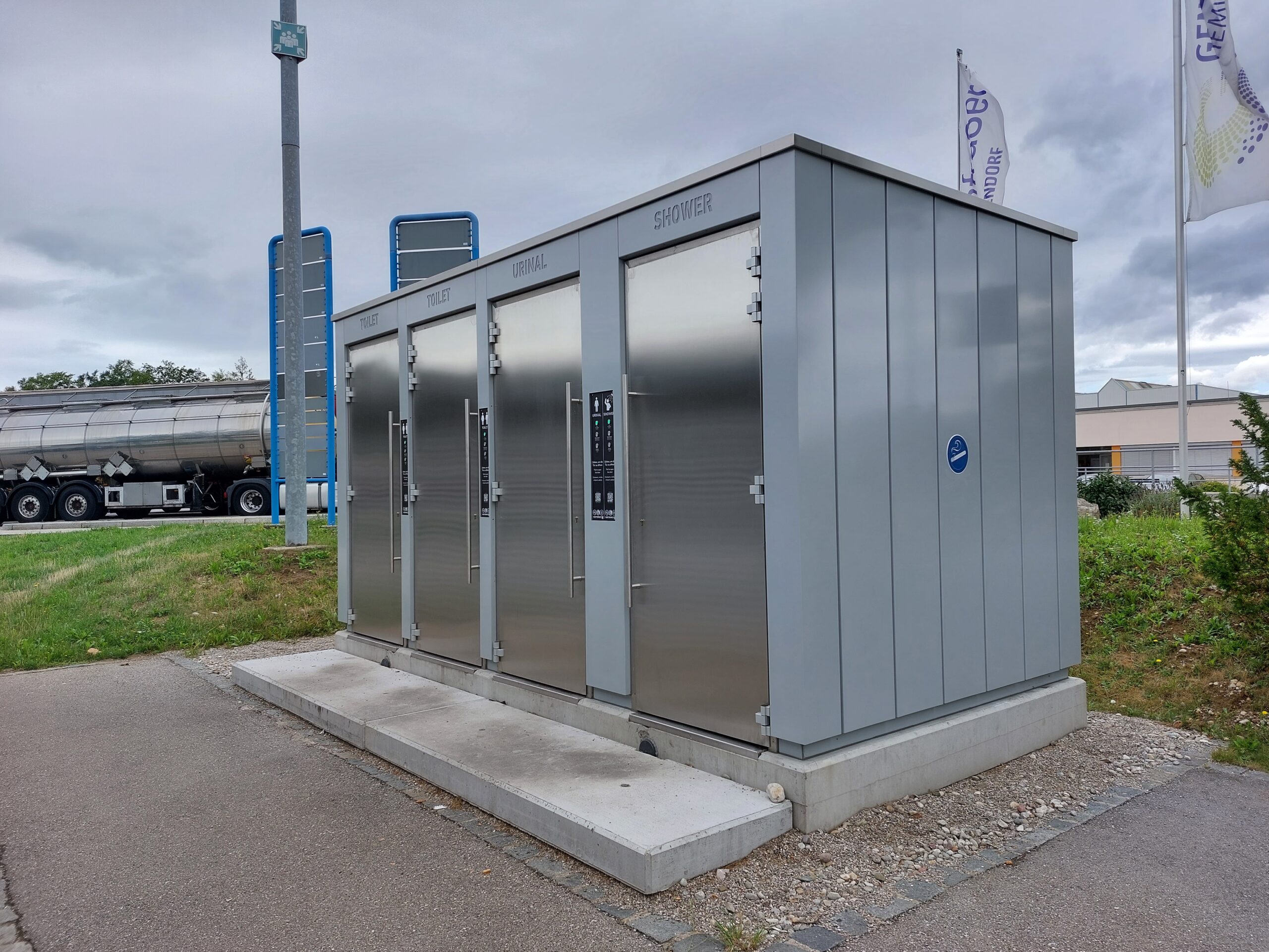 In the vicinity of Frankfurt am Main, on the parking lot at Infraserv, you will find our custom-made unit, equipped with two non-self-cleaning toilets, a separate urinal, and a shower facility. This toilet unit addresses the increasing demand from truck drivers for hygienic sanitary facilities at rest stops. Thanks to this contemporary solution in the field of toilet hygiene, truck drivers can now make use of our modern facility.